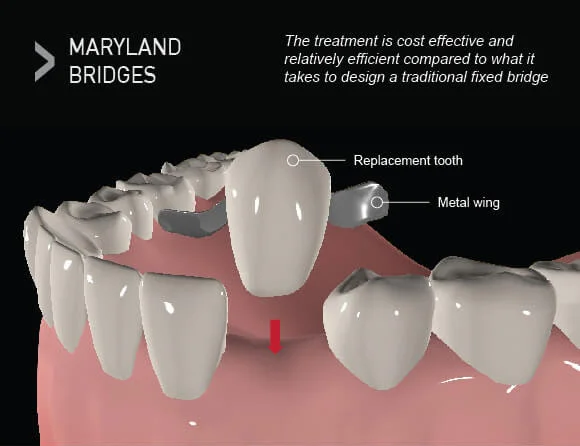 Maryland bridges use metal or porcelain frameworks bonded to the back of adjacent teeth. They are more conservative and require minimal alteration of natural teeth.