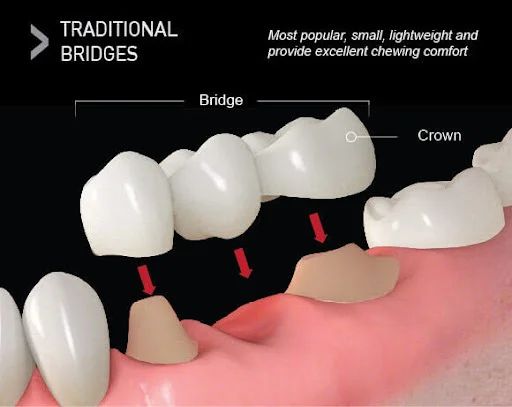 Traditional bridges are supported by natural teeth on either side of the gap. These supporting teeth are prepared to hold crowns, which anchor the bridge in place.